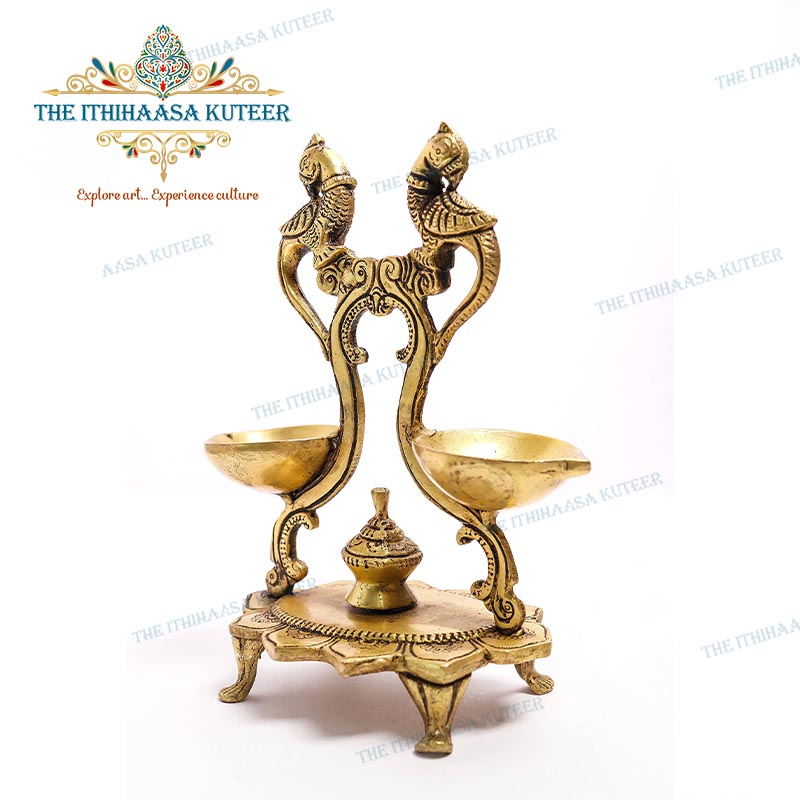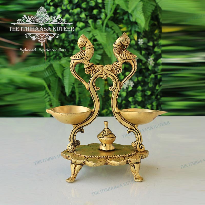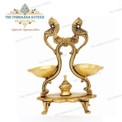 Description: Gracefully handcrafted in brass, this 7-Inch Twin Parrot Diya Stand features two intricately sculpted parrots perched atop a traditional oil lamp base. With its rich antique finish and fine detailing, this diya stand brings together artistic beauty and spiritual symbolism. Ideal for pooja rooms, festive décor, or sacred rituals, it adds a vibrant touch of tradition, purity, and elegance to any devotional or decorative setting.