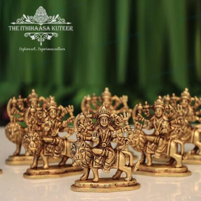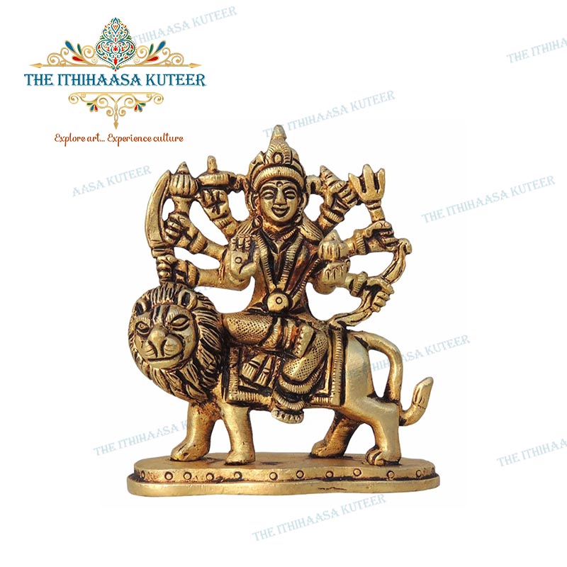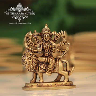 Description: Beautifully handcrafted in brass, this 3.5 inch Durga Devi idol radiates power, protection, and divine grace. Featuring the goddess in a majestic form with intricate detailing and an antique finish, this compact piece is ideal for pooja rooms, home altars, or spiritual shelves. A symbol of inner strength and devotion, it serves as a powerful devotional accent and a meaningful gift for those seeking blessings and spiritual energy.
