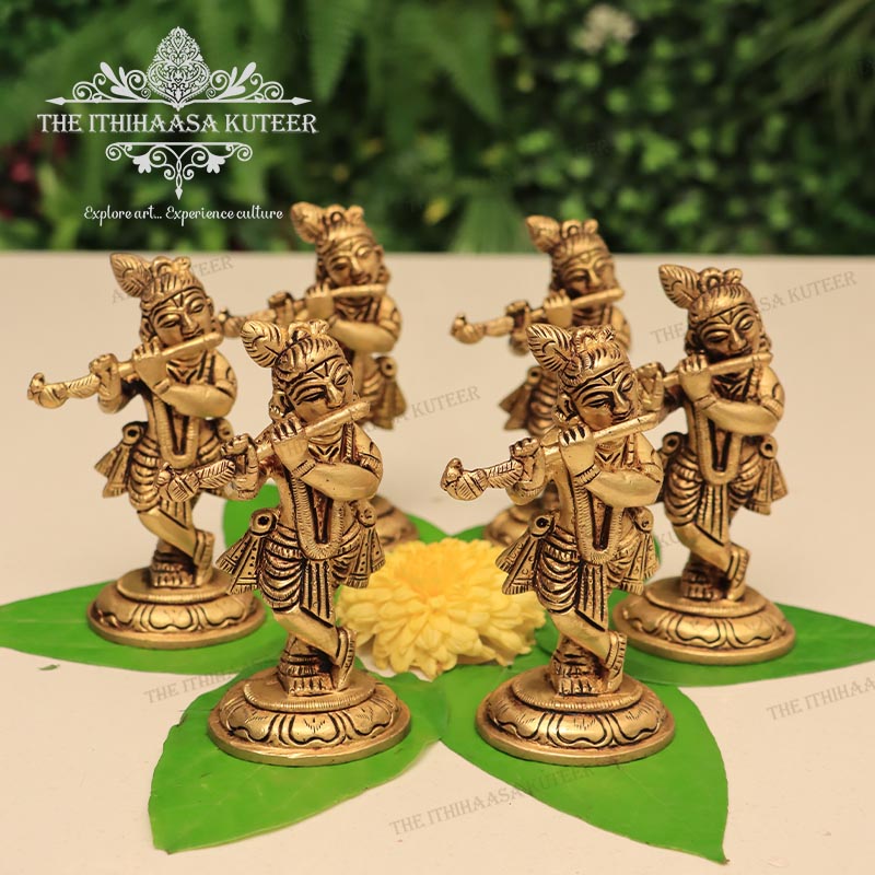 Delicately handcrafted in brass, this 4-inch Lord Krishna idol radiates divine charm, love, and spiritual serenity. Captured in a graceful pose with intricate detailing and an antique finish, this compact idol is ideal for pooja rooms, devotional shelves, or as a serene accent in any space. A symbol of wisdom, compassion, and eternal joy, it also makes a heartfelt gift for festivals, housewarmings, or spiritual occasions.