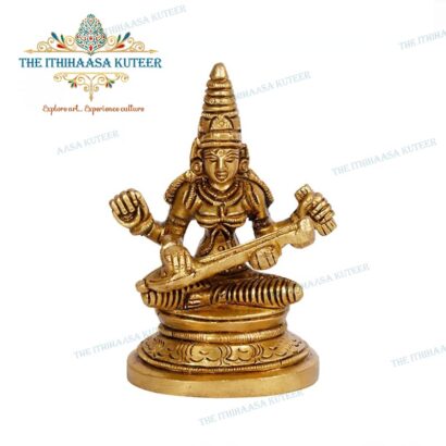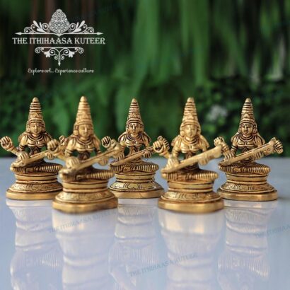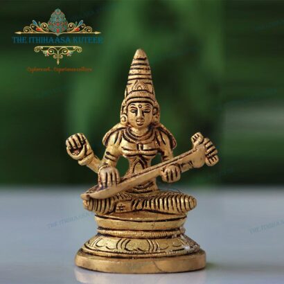 Description: Exquisitely handcrafted with super-fine detailing, this 4-inch Saraswathi Devi idol reflects grace, wisdom, and traditional Indian craftsmanship. Designed with a serene expression and an antique-inspired finish, it beautifully captures the goddess of knowledge and arts. A perfect addition to study tables, shelves, or personal altars, this compact divine figurine serves as a meaningful gift or a cherished accent that inspires learning, creativity, and spiritual calm.
