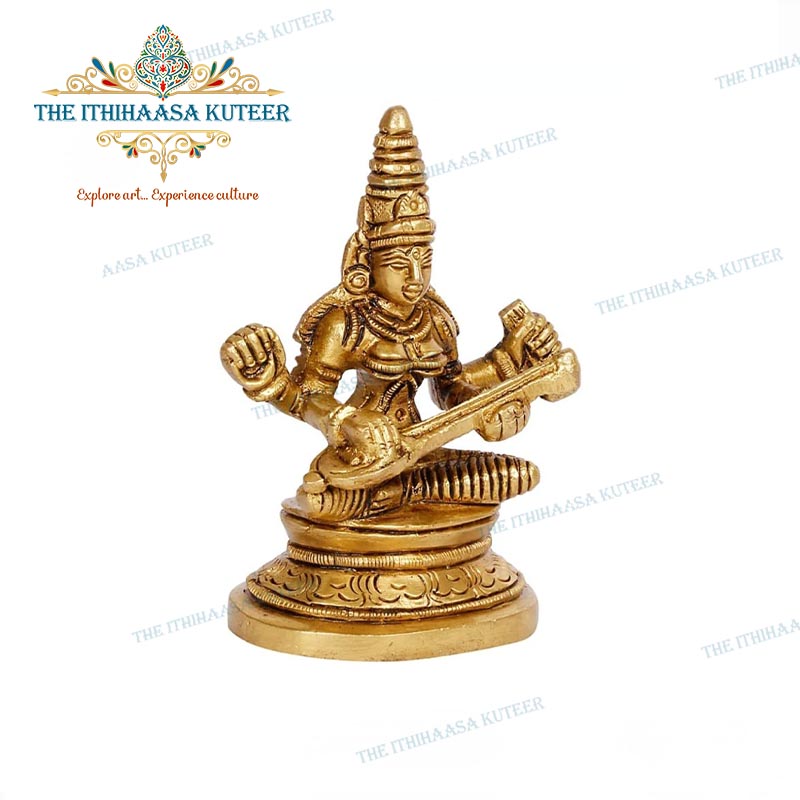 Exquisitely handcrafted with super-fine detailing, this 4-inch Saraswathi Devi idol reflects grace, wisdom, and traditional Indian craftsmanship. Designed with a serene expression and an antique-inspired finish, it beautifully captures the goddess of knowledge and arts. A perfect addition to study tables, shelves, or personal altars, this compact divine figurine serves as a meaningful gift or a cherished accent that inspires learning, creativity, and spiritual calm.