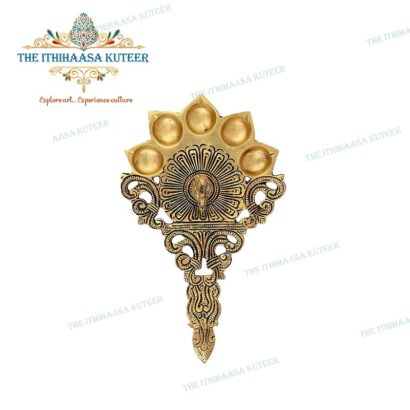 Description: Traditionally handcrafted in brass, this Pancha Aarthi Spoon features five interconnected diya holders, symbolizing the five elements and used during auspicious aarthi rituals. With fine detailing and a classic antique finish, it blends utility with spiritual elegance making it ideal for pooja ceremonies, temples, or devotional gatherings. A meaningful addition to your ritual accessories, it also makes a thoughtful gift for religious occasions or festival sets.