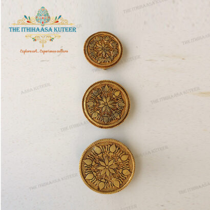 Description: Crafted from premium brass, this round stool features a beautifully detailed lotus design, symbolizing purity and spiritual balance. Ideal for your pooja room, it enhances the sacred space with elegance and serenity. The set includes three stools in varying sizes, perfect for placing idols, offerings, or lamps during rituals. Their versatile design makes them a thoughtful gift for housewarmings or festive celebrations.