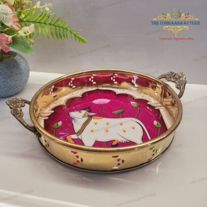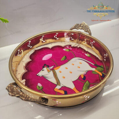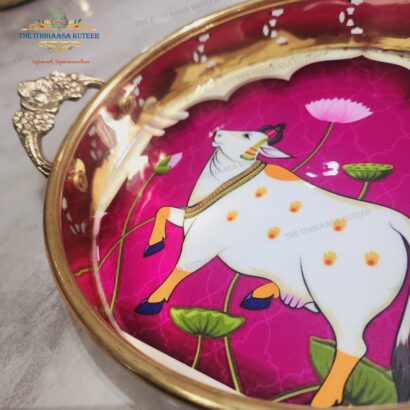 Add a touch of tradition to your kitchen with the Yellow Pichwai Cow Design Tray. Featuring intricate cow artwork, this tray is perfect for serving and decorative purposes. Its vibrant colors and cultural charm enhance any dining setting.