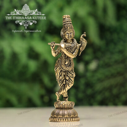 Description: Exquisitely handcrafted in brass, this 5.5-Inch Lord Krishna with Peacock idol captures the divine essence of Krishna standing gracefully alongside his symbolic peacock. With intricate carvings and a rich antique finish, this idol reflects serene divinity and artistic excellence. Ideal for pooja rooms, altar spaces, or festive decorations, it radiates a sense of devotion, peace, and cultural heritage making it a meaningful addition to any spiritual or decorative setting.
