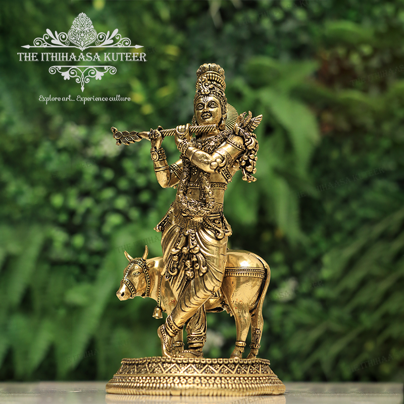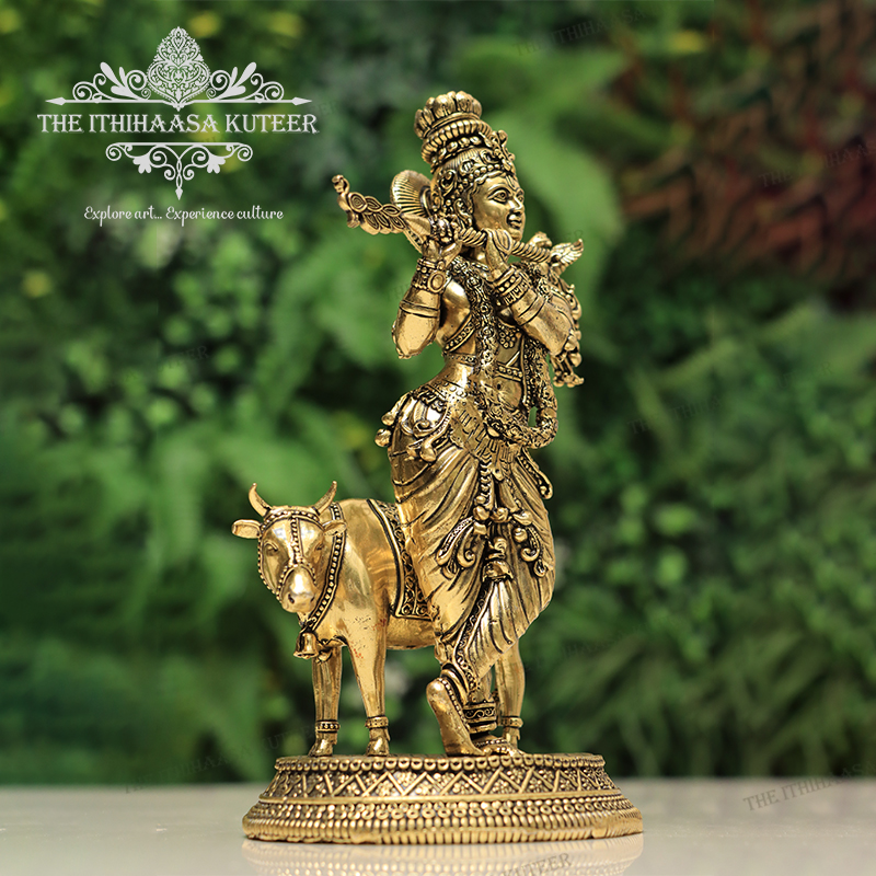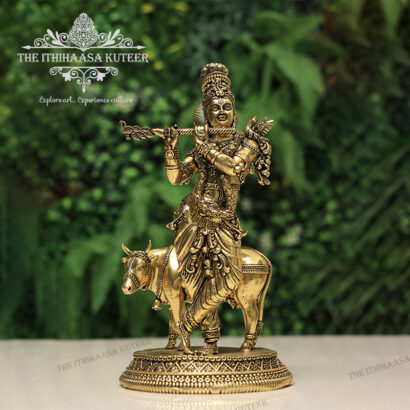 Description: Majestically handcrafted in brass, this Lord Krishna with Cow (Big) idol beautifully captures the divine bond between Krishna and his sacred companion. Depicted playing the flute with serene grace beside the gentle cow, this idol symbolizes love, compassion, and pastoral harmony. Adorned with intricate detailing and an antique finish, it is a perfect addition to pooja rooms, grand festive décor, or spiritual collections bringing peace, devotion, and timeless charm to any space.