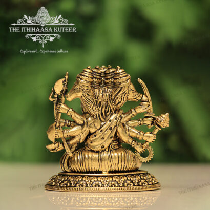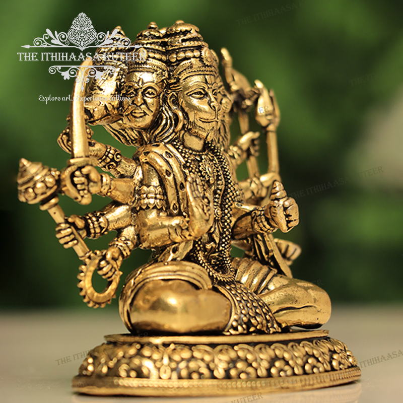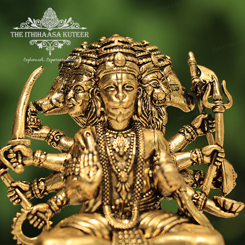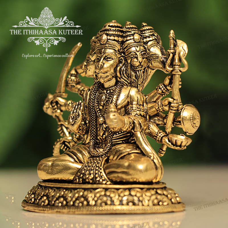 Description: Magnificently handcrafted in brass, this Panchamukha Lord Hanuman Idol features the revered deity in his powerful five-faced (Panchamukha) form Hanuman, Narasimha, Garuda, Varaha, and Hayagriva. Each face represents unique divine attributes such as courage, protection, wisdom, strength, and devotion. With intricate detailing and an antique finish, this idol radiates spiritual power and divine energy. Ideal for worship, protection from negative influences, and as a sacred addition to home altars or temples.