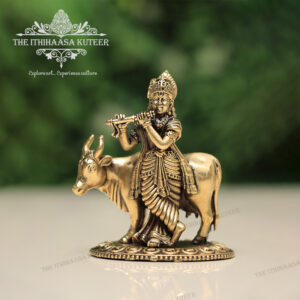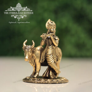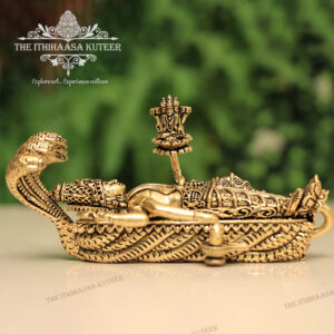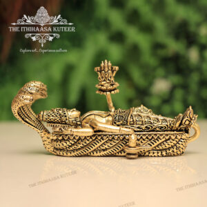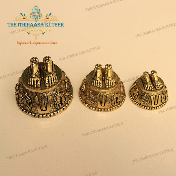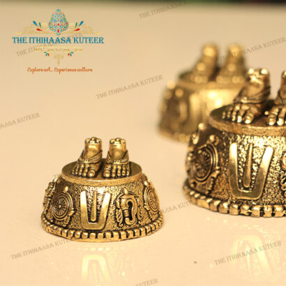 Description: Delicately handcrafted in brass, this Vishnu Paadham idol represents the sacred footprints of Lord Vishnu, symbolizing divine presence, protection, and spiritual progress. Traditionally placed in pooja rooms or at the entrance of homes and temples, these footprints are believed to invite blessings, positivity, and prosperity. Compact and intricately detailed, this piece is ideal for daily worship or as a sacred gift during religious ceremonies.